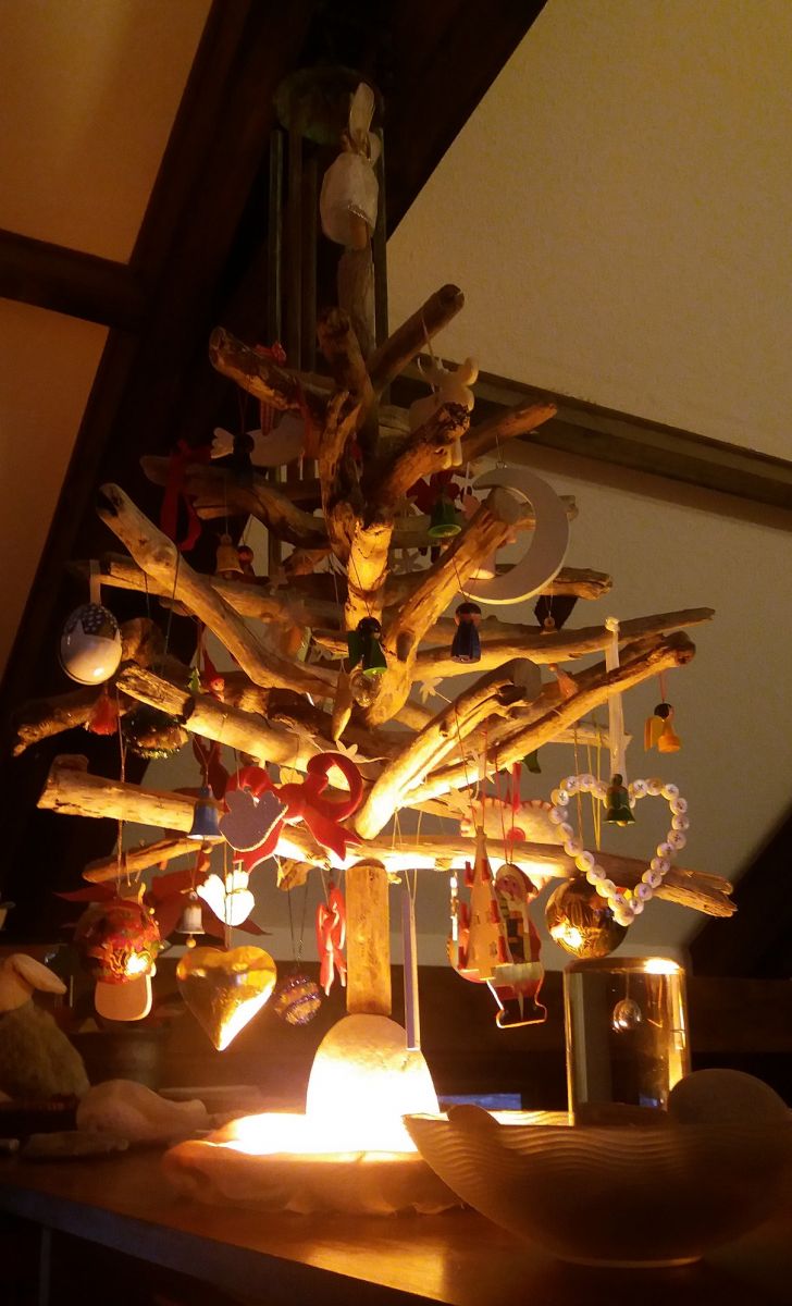 Our very favourite driftwood Christmas tree (waste not, etc) is hung with all the festive gee-gaws of many Christmases gone by but I thought it was looking a bit dull, sitting there on the bookcase. So what could be better than to haul out that super-slim LED panel, drape a piece of golden silk fabric (that's what you get for living with a textile designer . . . www.townhillstudio.co.uk if you're interested) and end up with the most gothic-looking piece of Christmas decoration that no one ever expected to see.