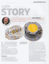 The first article looked at how LEDs have altered the shape and make-up of the light fitting. The second article 'Inside Story' goes inside the LED module itself and asks what we're going to do about the global comsumption and recycling of dwindling sources when they are used in such miniscule amounts in individual modules.